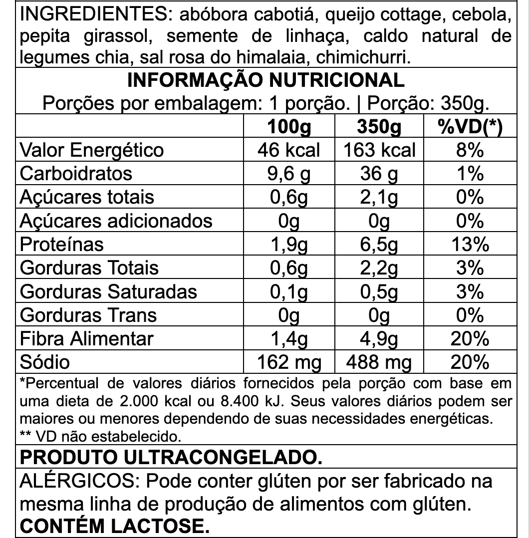 INGREDIENTES: abóbora cabotiá, queijo cottage, cebola, pepita girassol, semente de linhaça, caldo natural de legumes chia, sal rosa do himalaia, chimichurri.