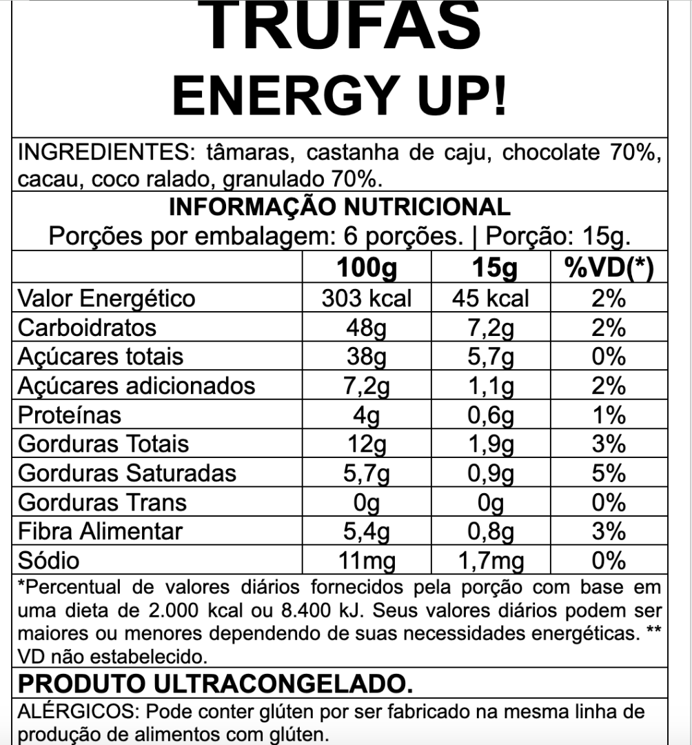 INGREDIENTES: tâmaras, castanha de caju, gotas de chocolate 70, cacau e coco ralado. Sem glúten (pode conter traços) | Sem lactose | Vegano PRODUTO ULTRACONGELADO. Porção: 90g (6 unidades).