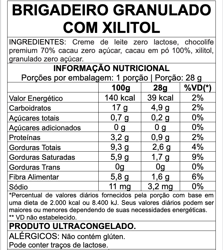 INGREDIENTES: Cenoura, farinha de aveia, ovo, açúcar demerara, óleo de girassol, chocolate 70%, semente de linhaça dourada, fermento químico. Sem glúten (pode conter traços) | Sem lactose (pode conter traços). PRODUTO ULTRACONGELADO. Porção: 100g.